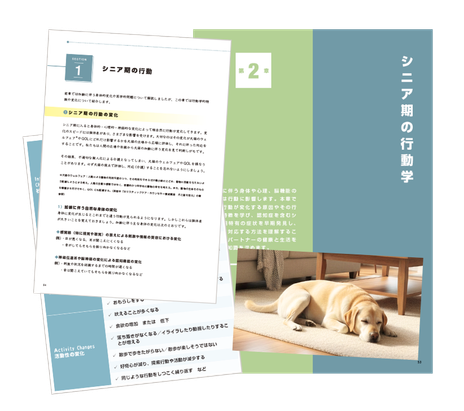 例えば「トイレの失敗」。「歳をとってわがままになった、怠慢になった」と考えるペットオーナーもいるかもしれませんが、背景には加齢に伴う身体機能や脳機能の低下、そして病気など、様々な要因が複雑に関係して発生しています。つまり、「老化」は病気だけでなく「行動の変化」も伴うのです。