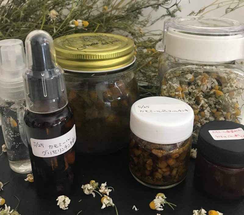 カモミールの自然療法のツールとしては、ハーブティーや精油、芳香蒸留水、フラワーエッセンス、ホメオパシーなどが入手可能です。ハーブティーの場合はジャーマン・カモミール、アロマテラピーの場合は主に甘い香りのローマン・カモミールの精油や芳香蒸留水が利用されることが多いようです。