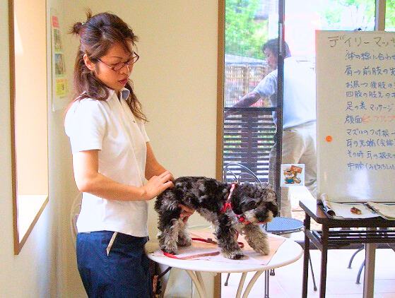 より様々なタイプの犬に慣れるため、保護犬の施設にマッサージボランティアとして参加したり、犬のイベントで無料マッサージをさせていただいたりしながら犬を触る経験を積みました。また、マッサージの知識を深めるために、社)日本ペットマッサージ協会の上級講座を受講し資格を取得。協会でセミナーが開催されるたびに講師のアシスタント役を務めることで、復習を続けました。このアシスタントとしての活動は、飼い主さんに伝える情報を貯めるとてもいい機会となっていました。