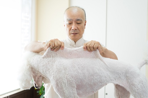 ③ 首から尻尾に向かって、背中の皮膚をやさしくひっぱるマッサージを10-20 回行います。