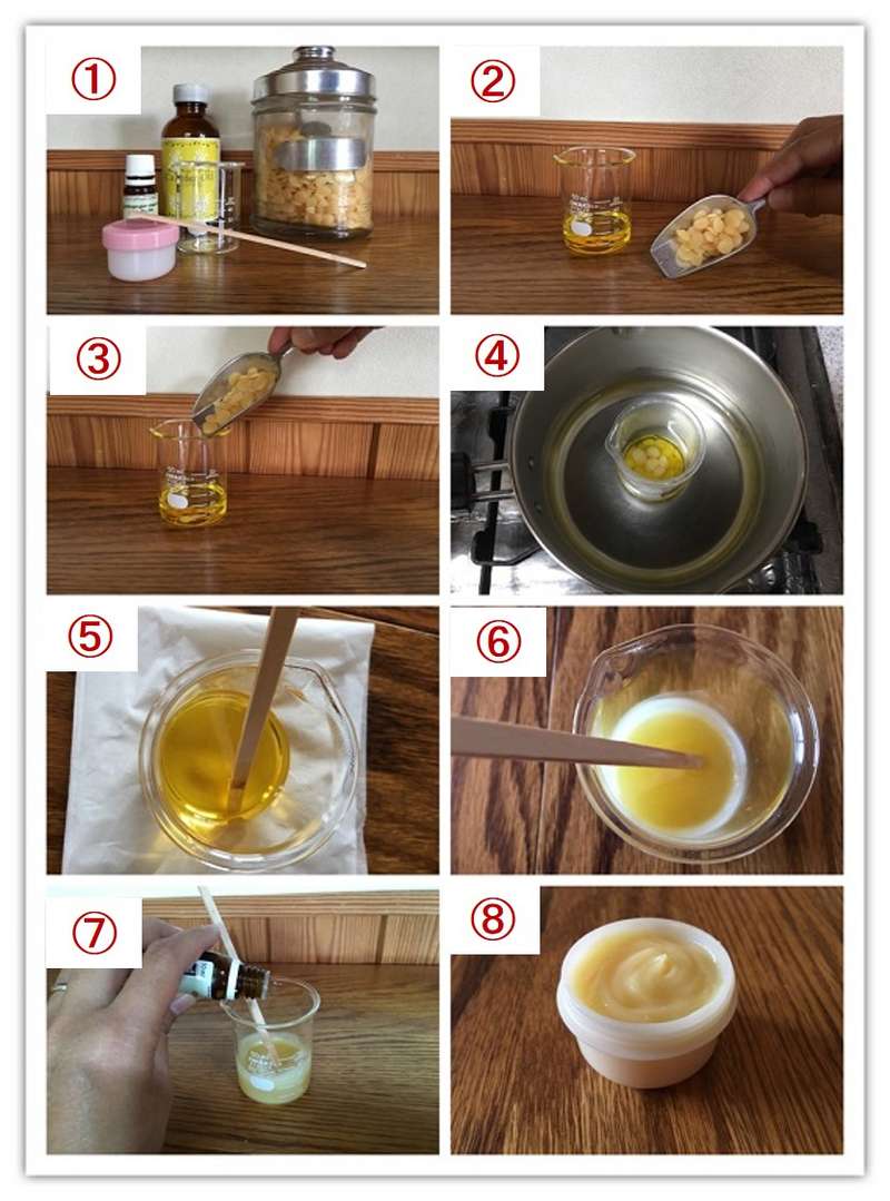 【準備するもの】ガラスのビーカー/キャリアオイル/ビーワックス(蜜蝋)/精油/混ぜる木の棒