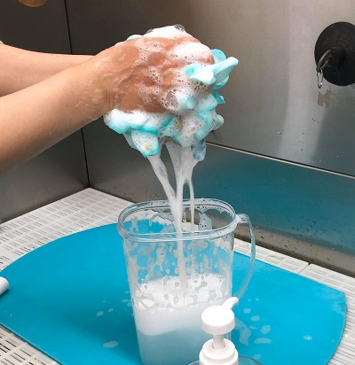 適切なシャンプー濃度は、水で薄めた際に、泡が立つかどうかで判断します。水で薄めてスポンジで泡立ててみてください。その時に泡が立つ濃度でシャンプーしてあげましょう。私は2倍~200倍の間で薄めて使用しています。