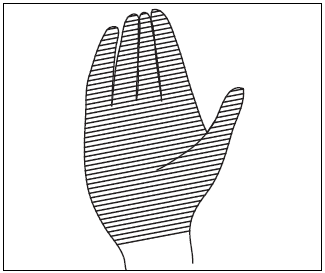 時計の短針6 時の位置から始めて時計回りに再び6 時になるまで皮膚を押し動かし、そのまま8時か9 時のところまで続けます。一つの円を描き終わったら、優しく手を離し(もしくはずらして)別の位置で同じように1と1/4の円を描いて皮膚を動かします。