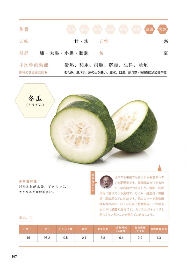 食材解説ページでは、栄養特性・カロリーに加え、薬膳の観点から「五味・五性・帰経」など体質に合わせた食材選びのための情報も掲載されています。