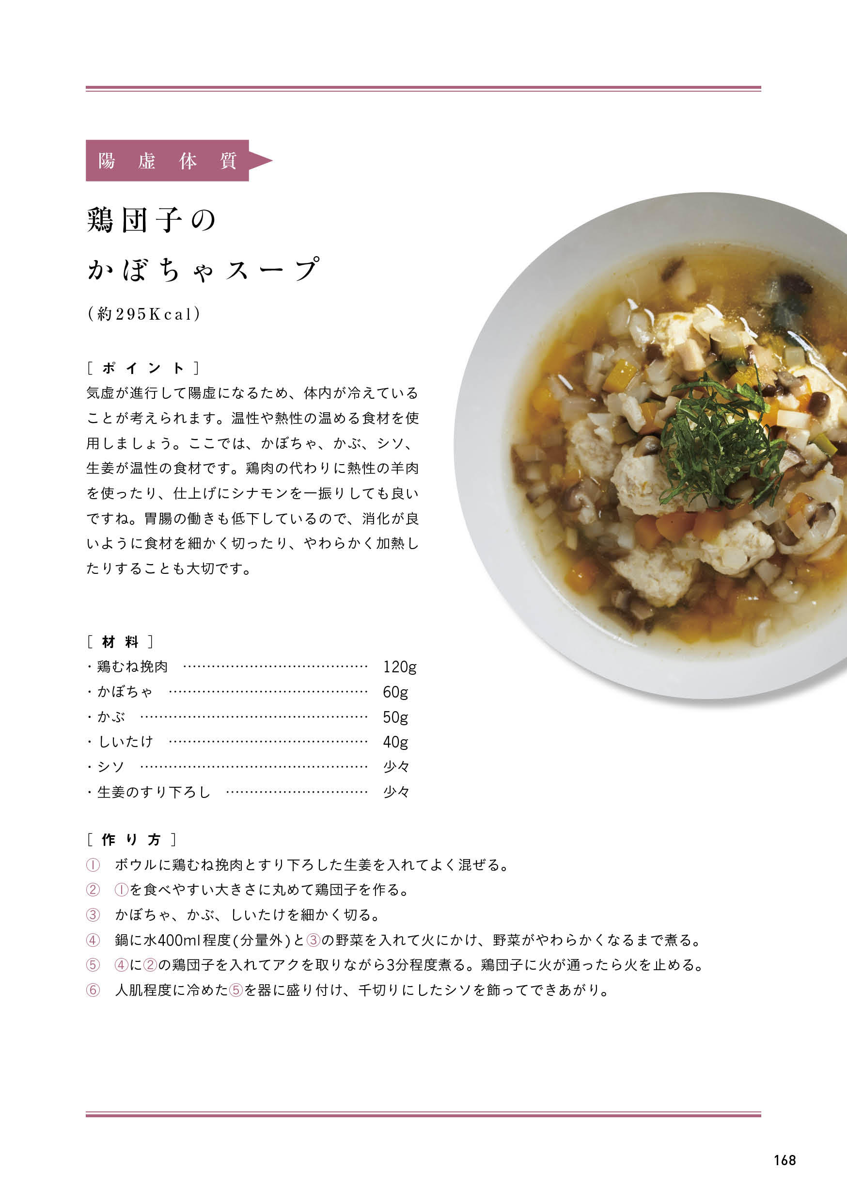 中医学に基づく8つの体質に対応するレシピと、季節別のおすすめスープを掲載。調理方法を変える、似た特徴の食材を使う、などでアレンジもしやすいレシピ。