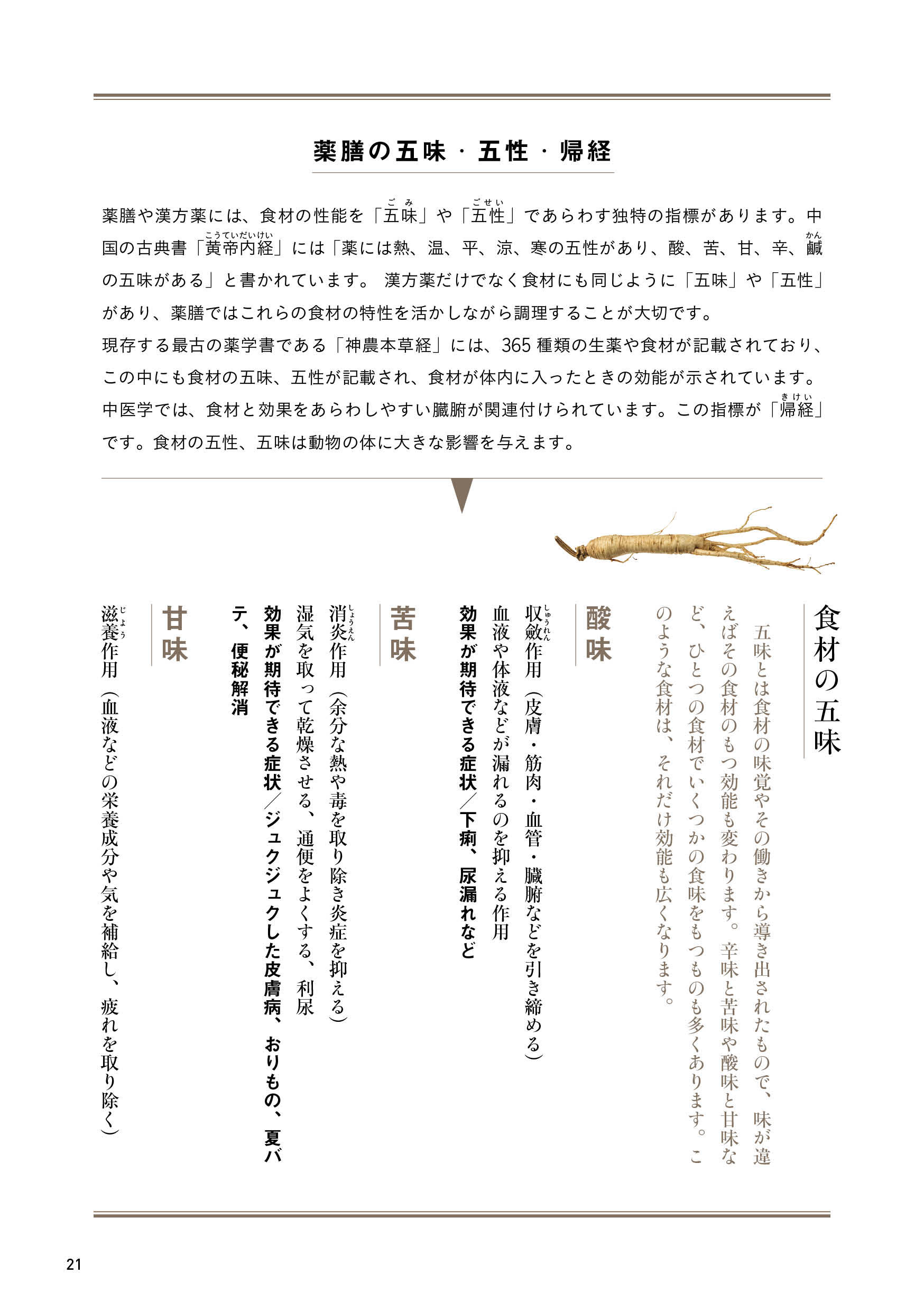 また、お馴染みの食材だけでなく、薬膳ならではの生薬や香草なども掲載。新しい食材との出会いがあったり、すでに知っている食材の新たな一面を知れたりと、図鑑のように楽しめます。