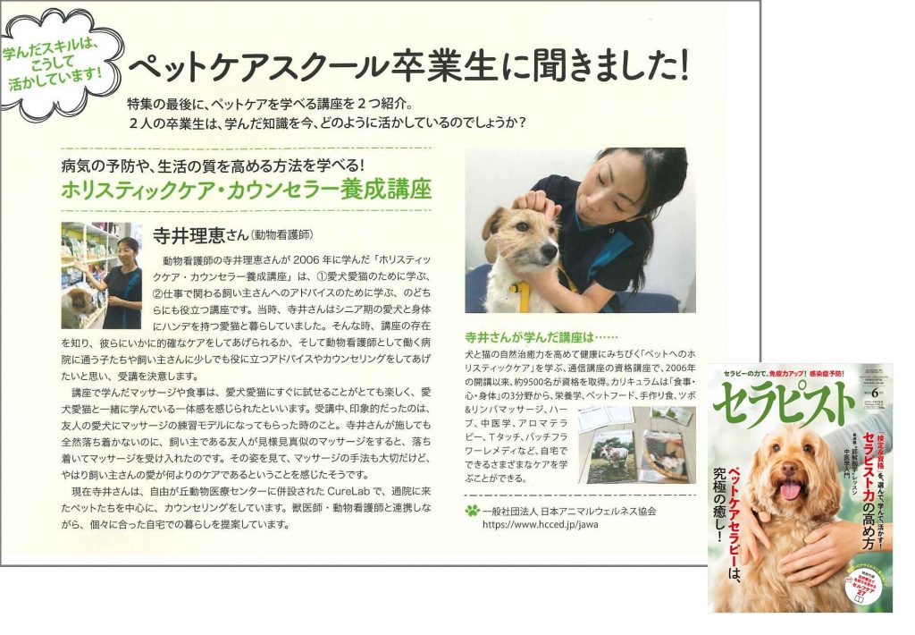 ホリスティックケア・カウンセラーとして動物病院で活動している修了生・寺井理恵さんが、雑誌『セラピスト』(2020年6月号)の特集『ペットケアセラピーは、究極の癒し!』に掲載されました。