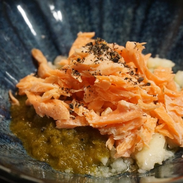7.サーモンはフライパンやグリルで焦がさないように焼き、身を細かくほぐして骨があれば取り除く。