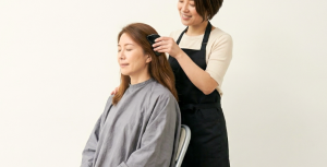 セラピストが刮痧専用のプレートを使って頭皮をマッサージ。