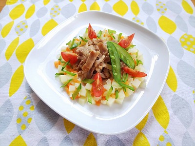 5.器に4の豚肉と3の野菜とトマトを盛り付けてできあがり。