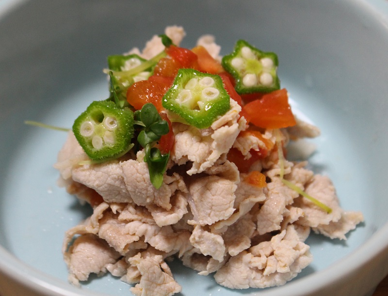豚肉でおいしく夏バテ予防。夏が旬のオクラ、抗酸化作用のあるブロッコリースプラウト、彩りにもなるプチトマトをトッピングしました。