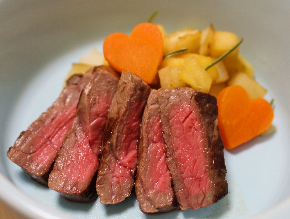 1. じゃがいもは皮をむき1cm角に切って茹でておく。 2. りんごは皮をむき小さめの角切りにしてレモン汁と一緒に鍋に入れて蓋をして弱火で5分程蒸し煮にする。 3. にんじんは型抜きしてやわらかくなるまで茹でておく。 4. フライパンにオリーブオイルを引き、強火にかける。 5. フライパンが十分に熱くなったら牛もも肉を入れて片面1分ずつ強火のまま両面焼く。最後に側面もさっと焼いたら取り出してアルミホイルで包んでおく。 6. 肉を焼いたフライパンにオリーブオイルを入れ、1のじゃがいも、2のりんご、ローズマリーの葉を入れて中火で炒める。 7. アルミホイルに包んだまま10分程置いておいた牛もも肉を切って、6と3と一緒に器に盛り付ければ出来上がり。