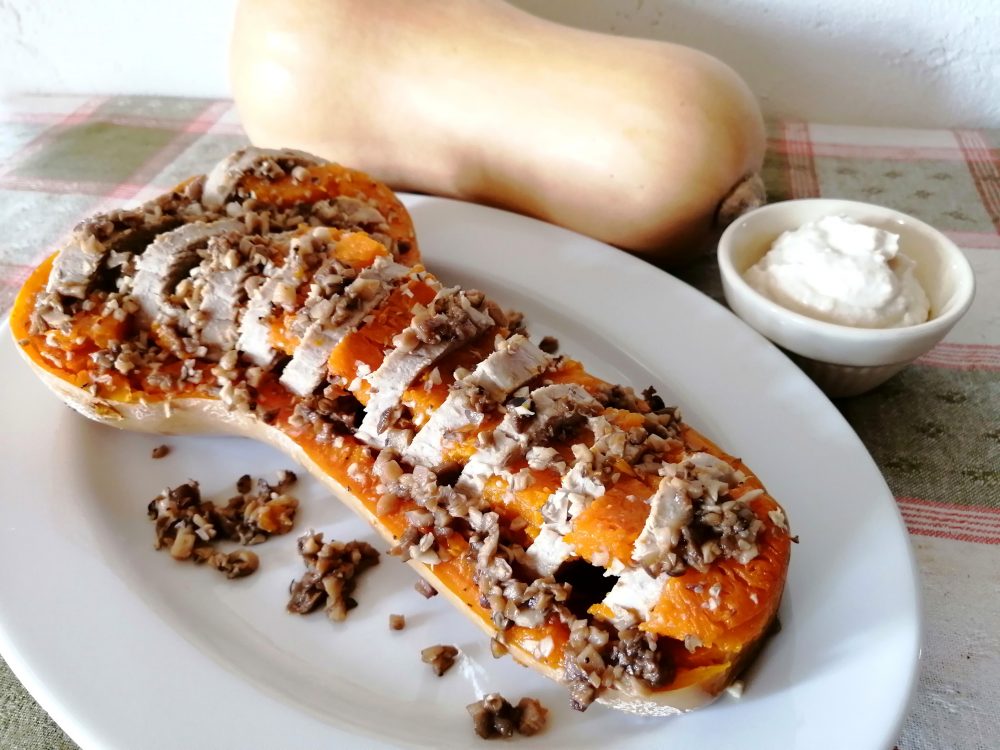 甘くてほくほくのかぼちゃと豚肉を重ねて、蒸し煮にしたお料理です。少しオリーブオイルを入れて加熱することで、きのこの風味を際立たせました。ナッツのこくがあってクリーミーな「ピーナッツヨーグルトソース」が、あっさりした豚ヒレ肉にぴったり。とても美味しい一皿なので、人間用には塩胡椒をして、ぜひ愛犬と一緒に召し上がってください。